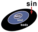 | But before man could receive God as life into his spirit, sin entered into him (Rom. 5:12). Sin deadened his spirit (Eph. 2:1), made him an enemy of God in his mind (Col. 1:21), and transmuted his body into sinful flesh (Gen. 6:3; Rom. 6:12). Thus, sin damaged all three parts of man, alienating him from God. In this condition, man could not receive God.). |